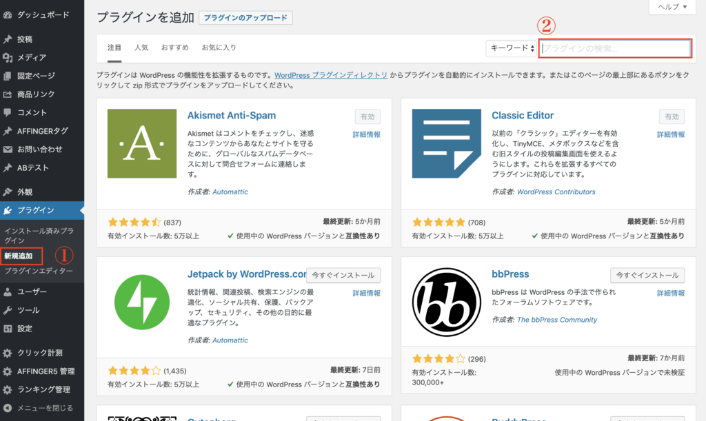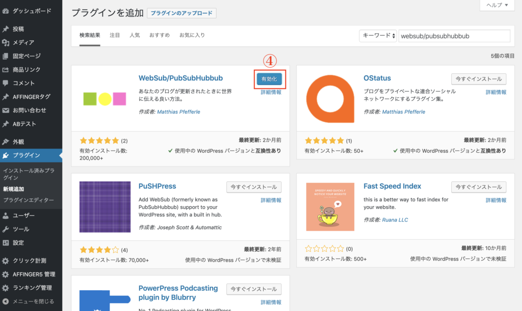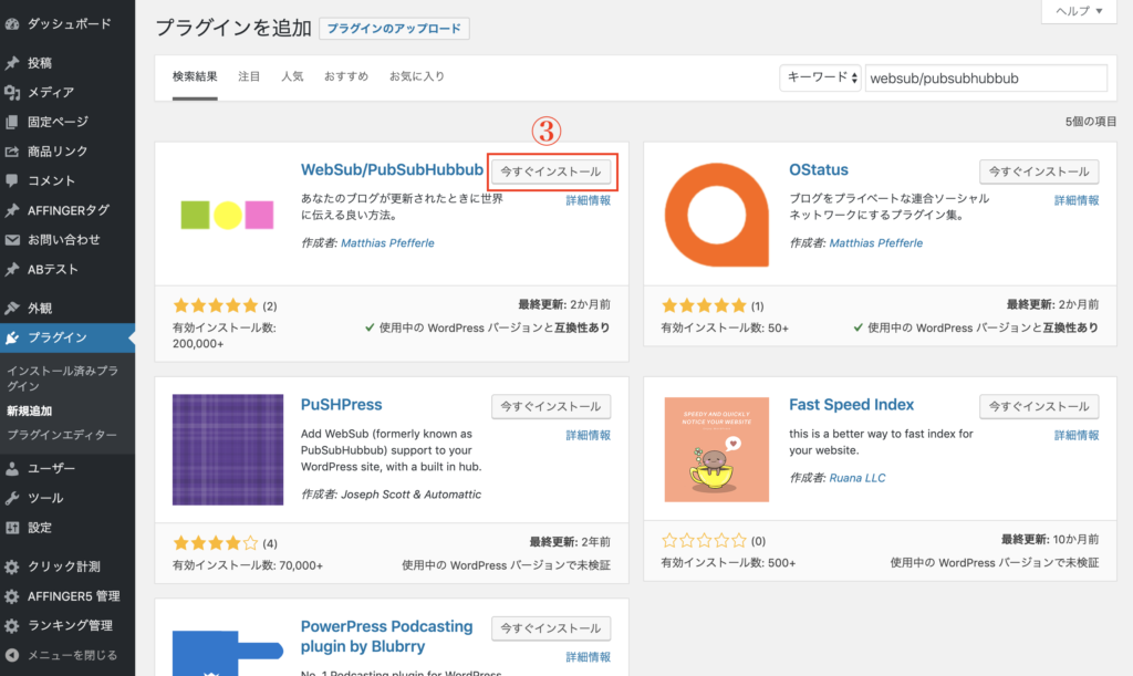 まずは、【WordPressの管理画面】→【プラグイン】→【新規追加】から『websub/pubsubhubbub』と検索