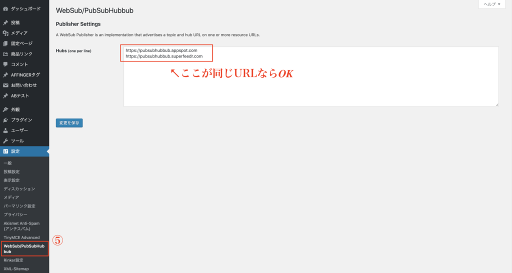 最後に、【設定】→【WebSub/PubSubHubbub】の中のURLが、下記のものと同じであれば終了です。